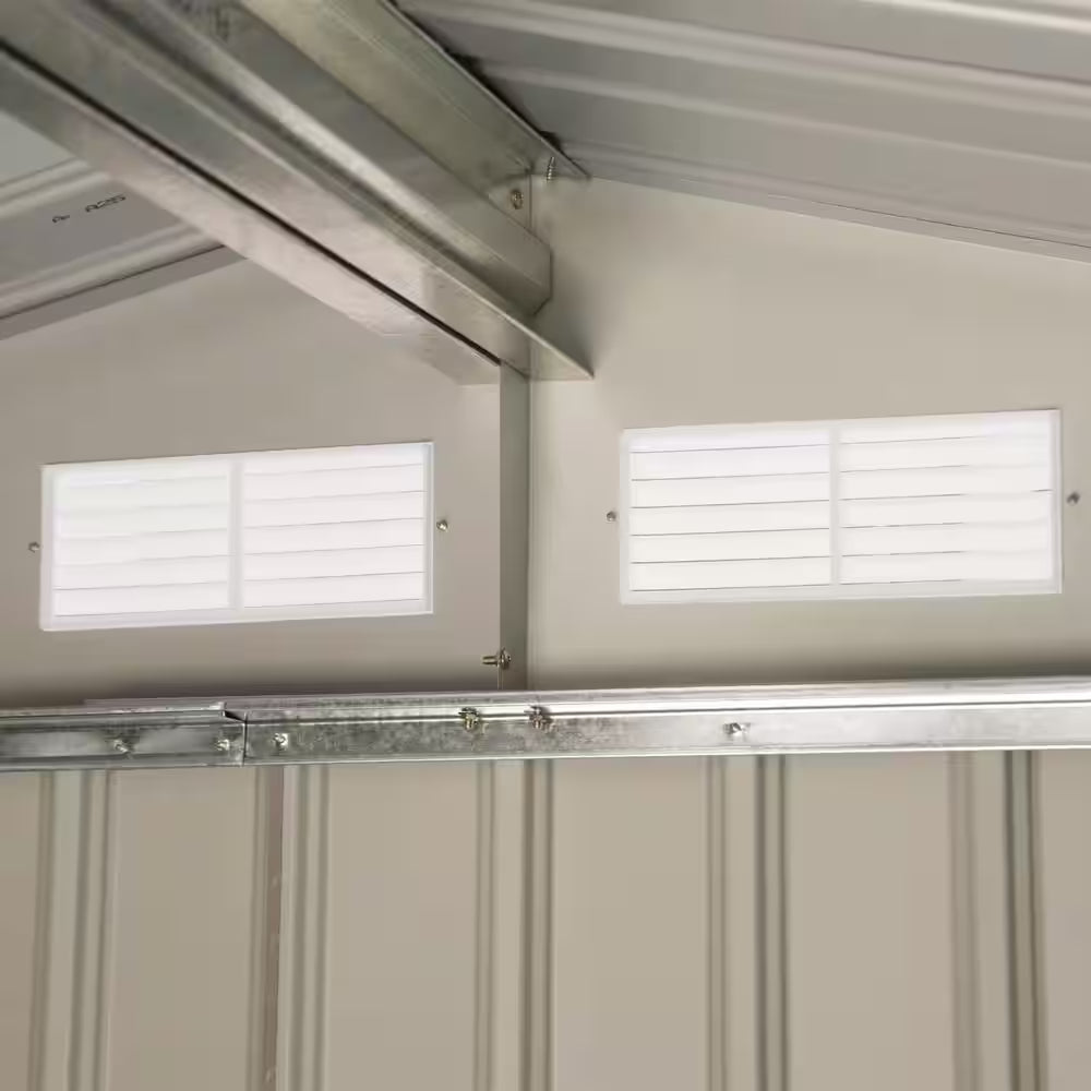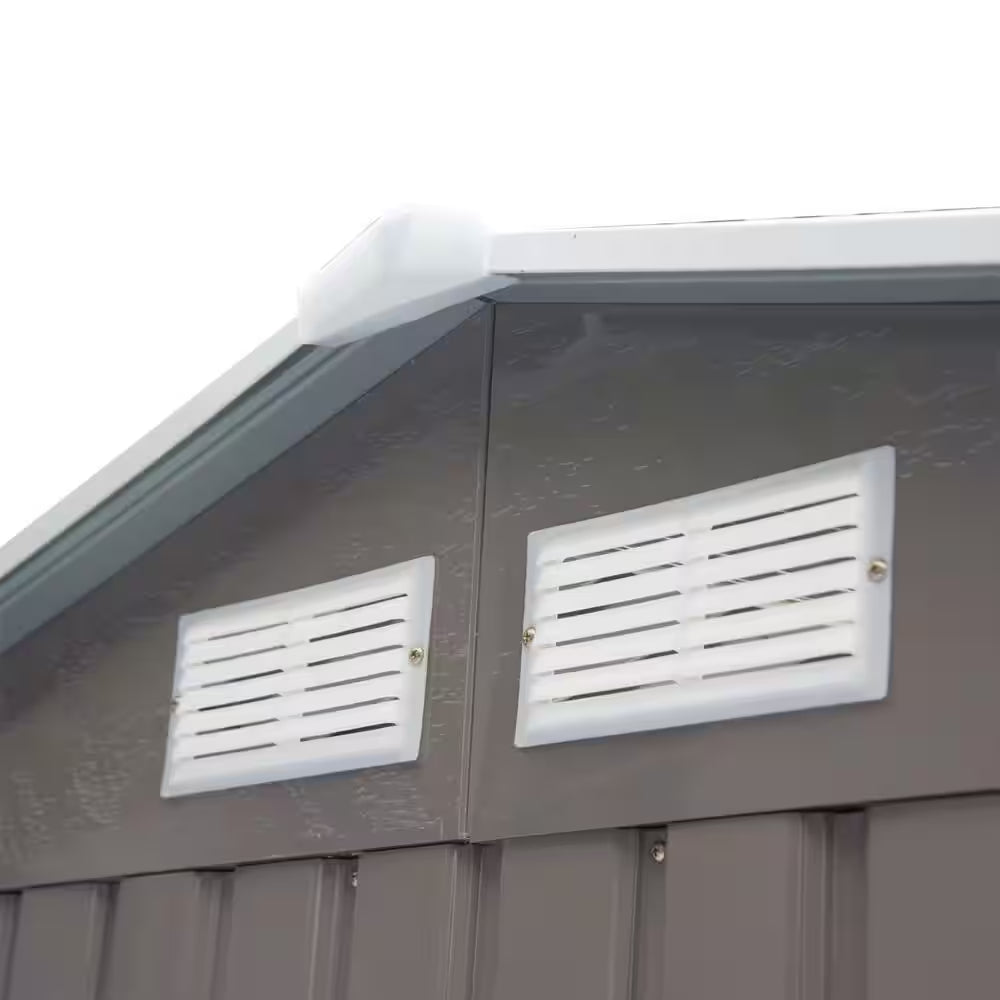 - Good Ventilation: Our metal outdoor storage sheds feature four ventilation slots on the front and back, increasing light and airflow. This prevents odor and keeps your equipment and tools dry.
