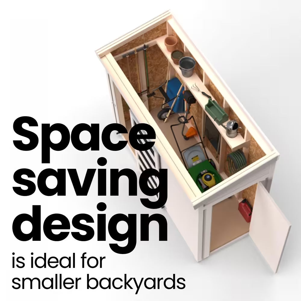 - Lots of vertical storage space for things like shelving units and long-handled tools