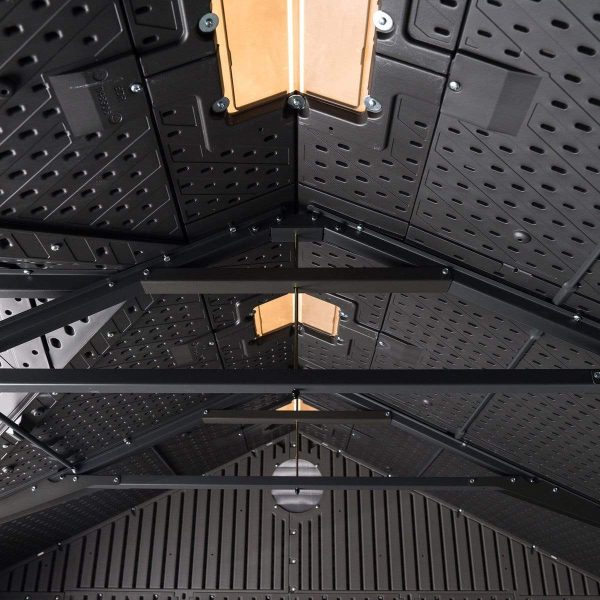 This Lifetime rough-cut outdoor storage shed has eight-pane windows in the doors, two side windows and four skylights that provide ample natural light so you can see your belongings without a flashlight. The polycarbonate windows open halfway to give you some fresh air, and the two screened vents help provide airflow while keeping out bugs and other pests.