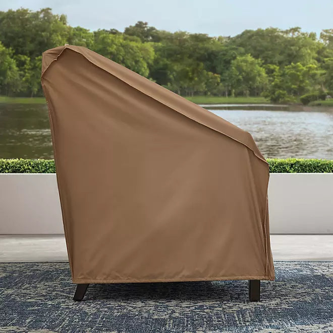 Created by industry-leading designers exclusively for Member’s Mark and Sam’s Club, the Newcastle Deep Seating Fire Pit Chat Group features a lovely mix of materials for a look that says traditional, but with clean, elegant lines and enduring functionality. Gently curved arms are extra wide for added comfort, and all the seating, table, and ottoman bases are wrapped with a multi-hued, fade-resistant all-weather wicker. The show-stopping fire table design includes a hidden propane tank compartment, easy-to-use push-button ignition, and adjustable flame control. An attractive burner cover is included and adds extra serving space when your fire pit is not in use. The porcelain-top table is accented with a decorative tile inlay border and framed with rust-free aluminum with a hand-applied wood-look finish for long-lasting beauty.