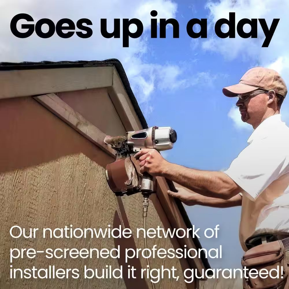 - Includes black shingles, roof felt and drip edge, floor decking system, worry-free delivery and on-site installation with purchase