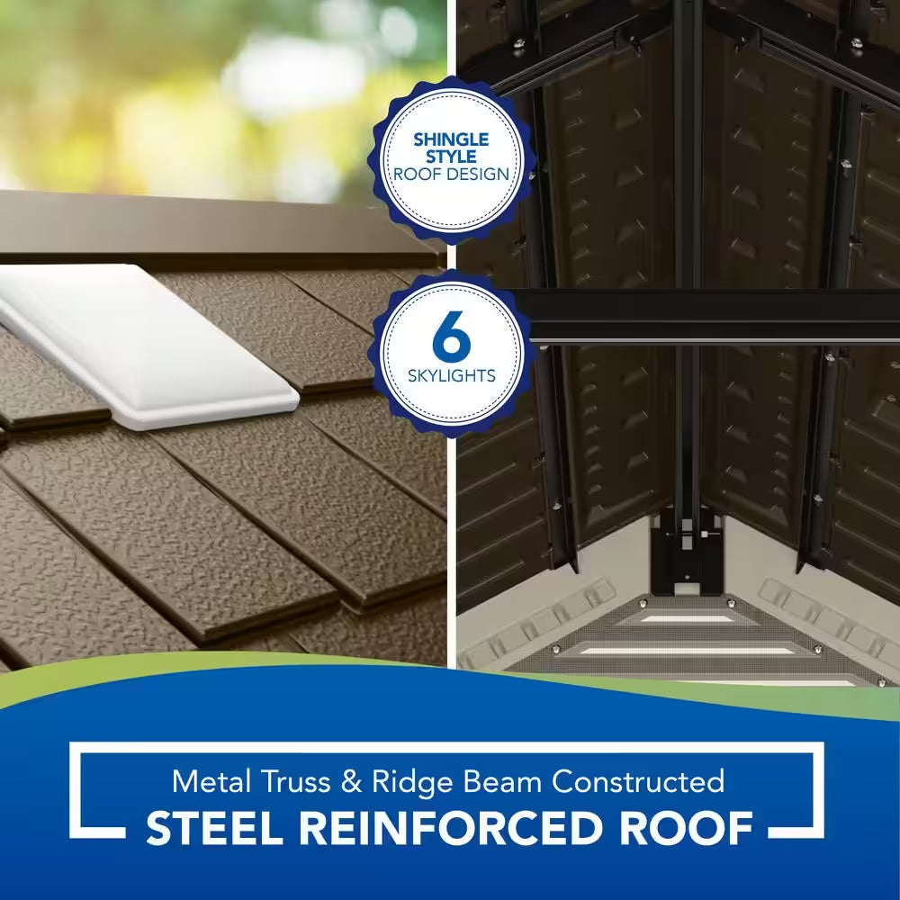 - Classic shed design with architectural details and metal-reinforced shingle-style roof panels